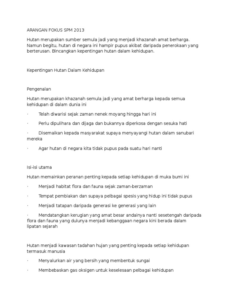 Kesimpulannya kita mesti sedar akan kepentingan memelihara alam semulajadi yang masih ada. Jom kita lihat kepentingan hutan. Nota Komsas Isi Karangan Contoh karangan SPM PT3 STPM.